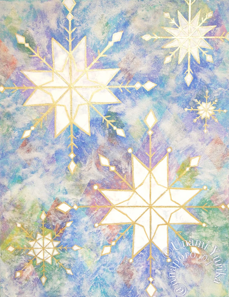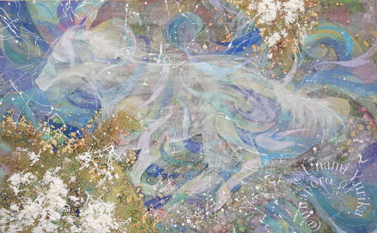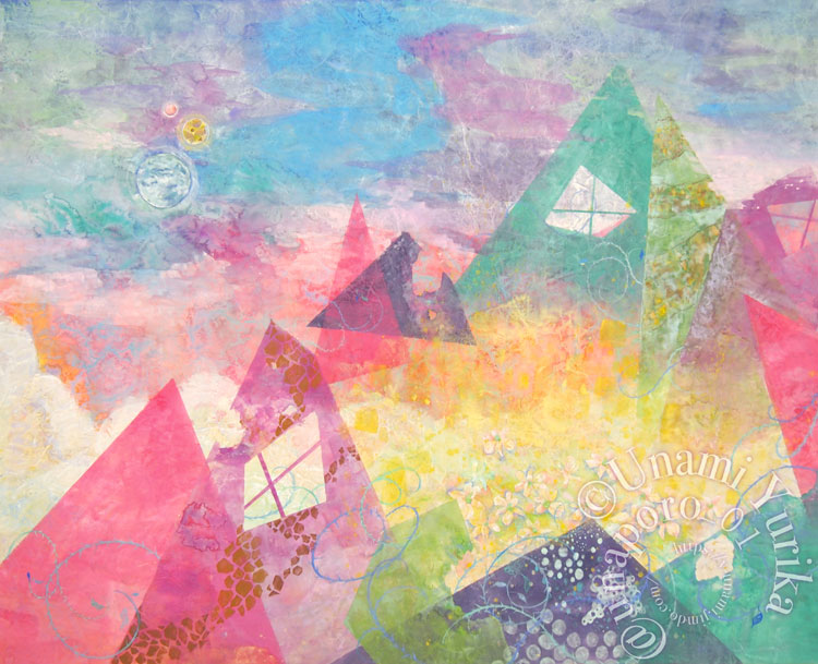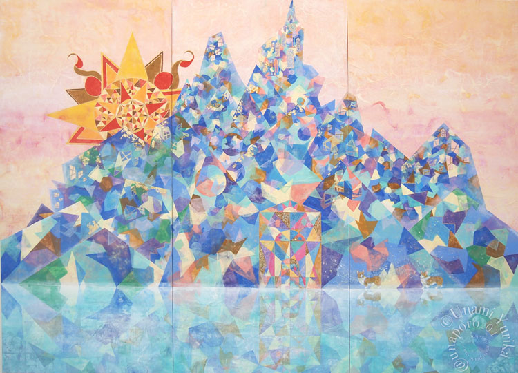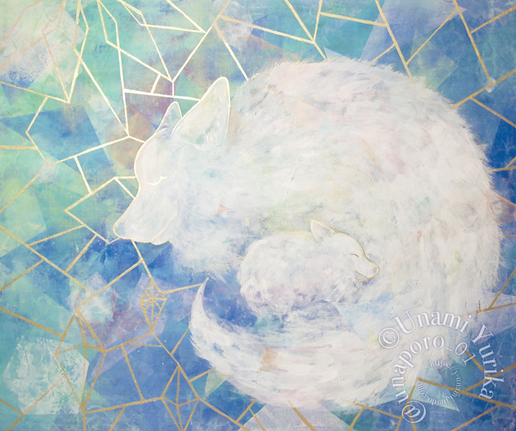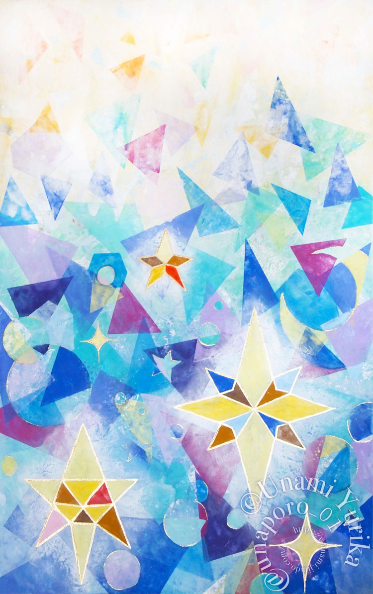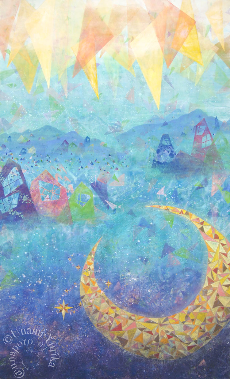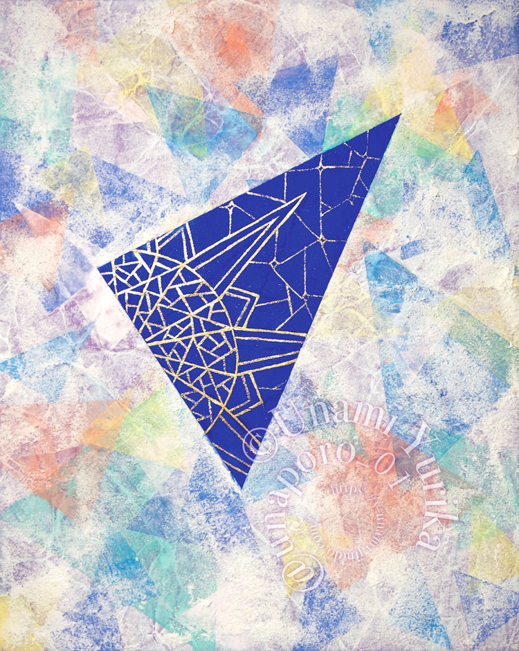 2014年 / 雲肌麻紙に岩絵具,純銀箔,洋金箔,金属粉,貝彩石,蛍光塗料 / F0号 / (個人蔵)