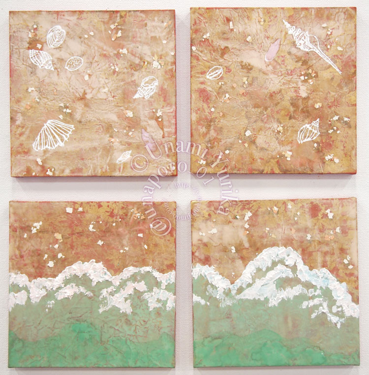 2012年 / 雲肌麻紙に岩絵具,貝,砂 / 300×300mm×4枚
